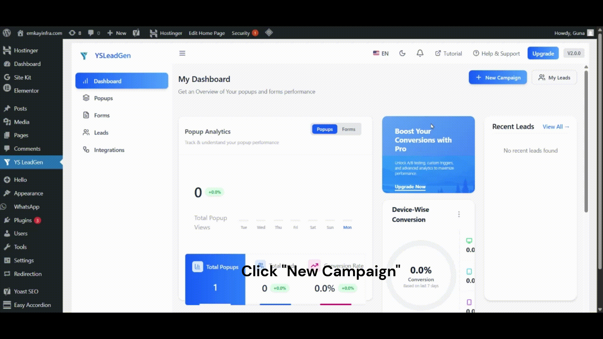 Once activated, YS LeadGen will appear in your WordPress admin menu.